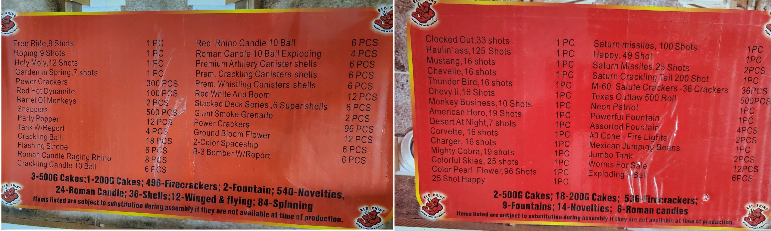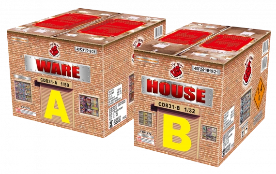 It contains 5 top selling 500G cakes, 14 top selling 200G multi-shots, 5 artillery shell kits, 11 fountains, 5 saturn missile batteries (3 varieties), 30 roman candles (multiple varieties), novelties, flying items, spinning items, firecrackers (4 varieties), smoke and sparklers. The items are all full line Red Rhino private label items. No generic Chinese “assortment” items are used to fill this kit. Sold as a pair! You get both, Ware (A) & House (B)!!